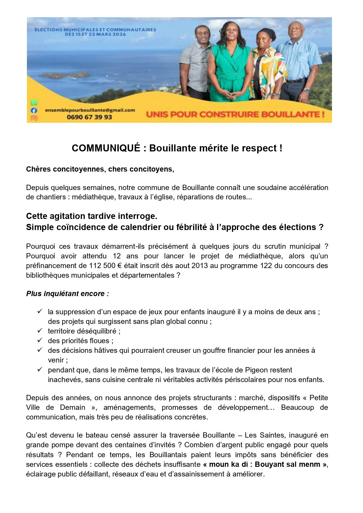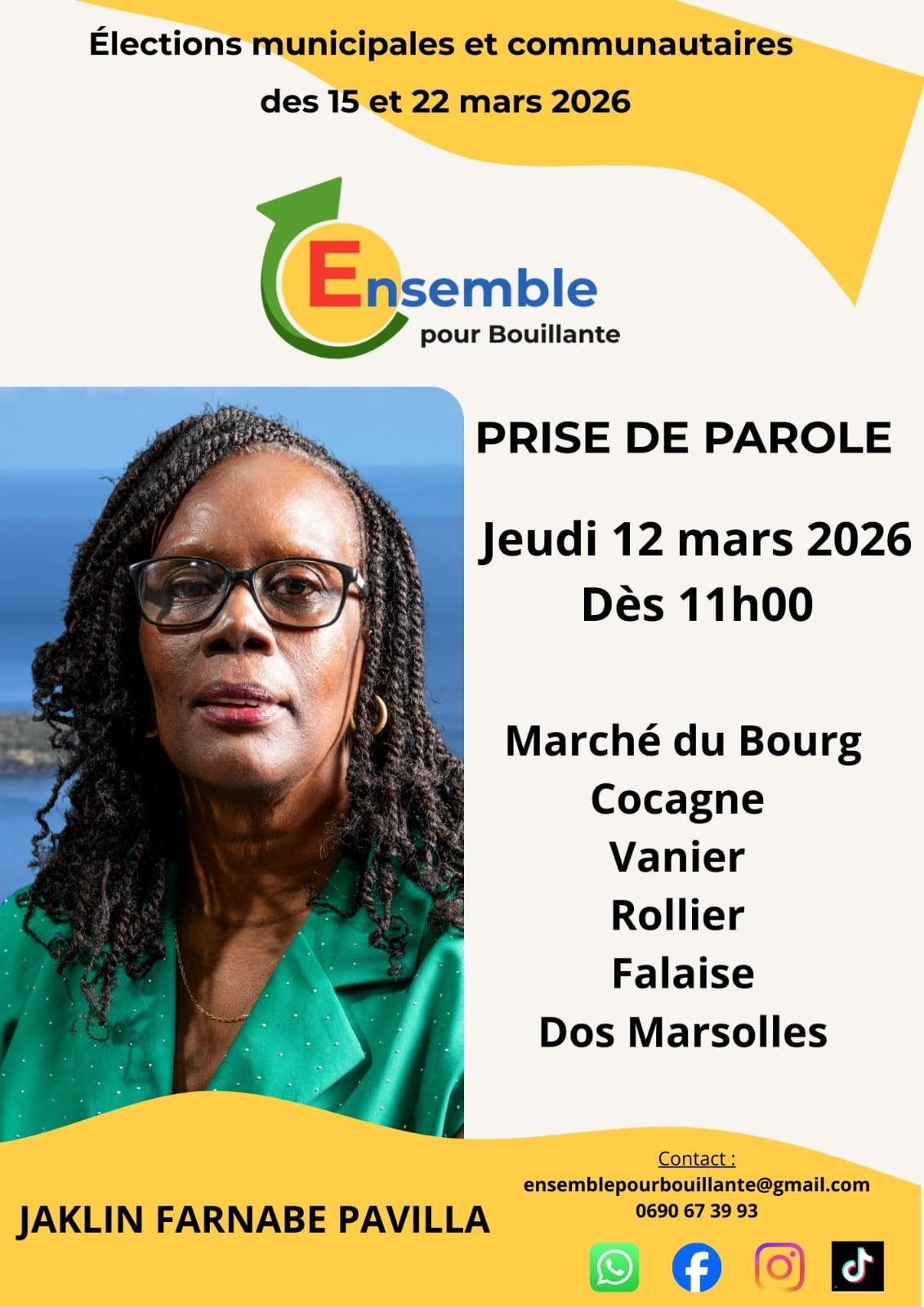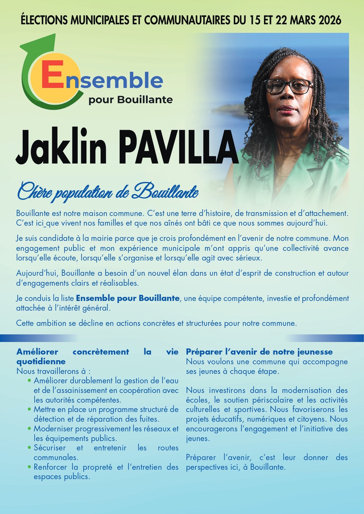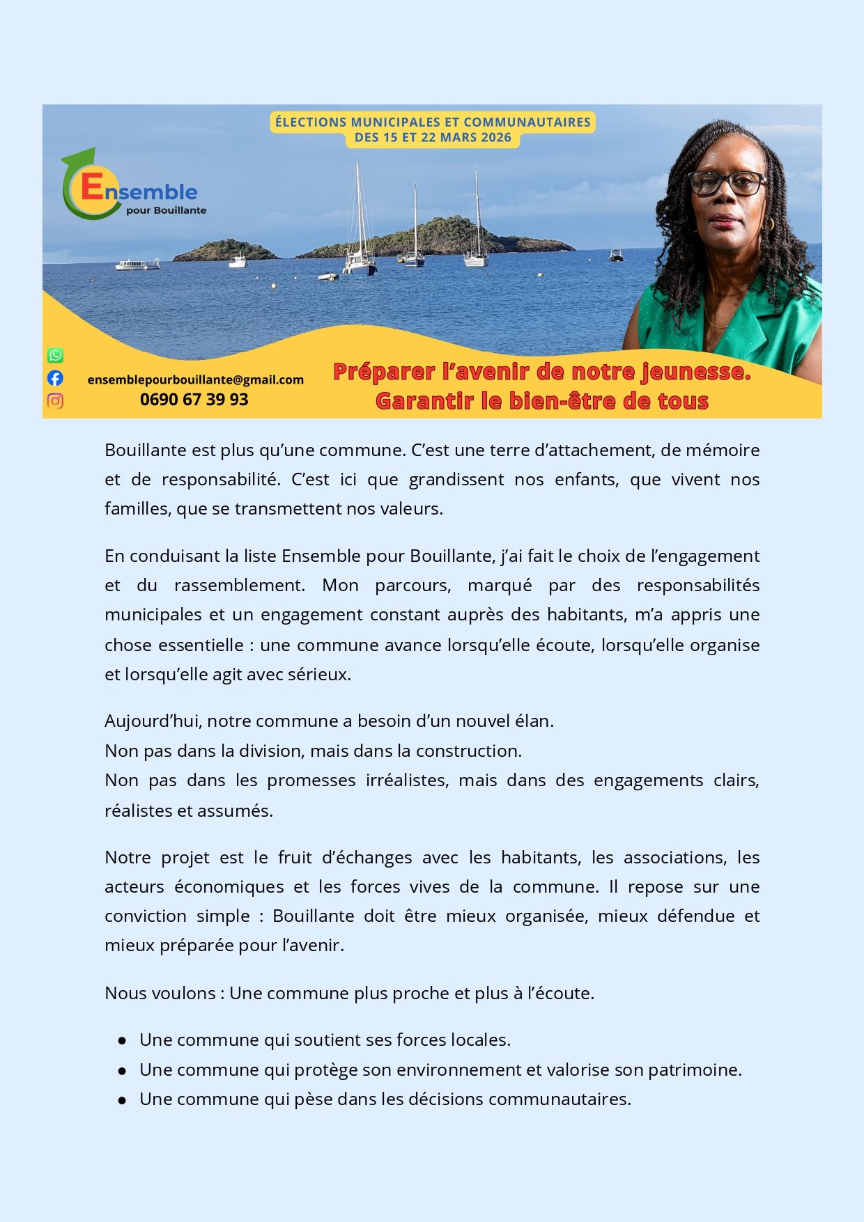 Ma candidature repose sur une conviction simple et forte : les Bouillantaises et les Bouillantais doivent être en mesure de choisir un programme qui nous permet de construire ensemble l'avenir de notre commune. L'équipe que je suis fière de conduire est ancrée dans la réalité locale. Elle est attentive aux besoins de chaque quartier, respectueuse de notre environnement et engagée aux côtés de la jeunesse. Nous voulons renforcer la proximité, soutenir les initiatives locales, valoriser la vie associative et remettre la population au cœur des décisions. En un mot, apprendre à faire société, ensemble.