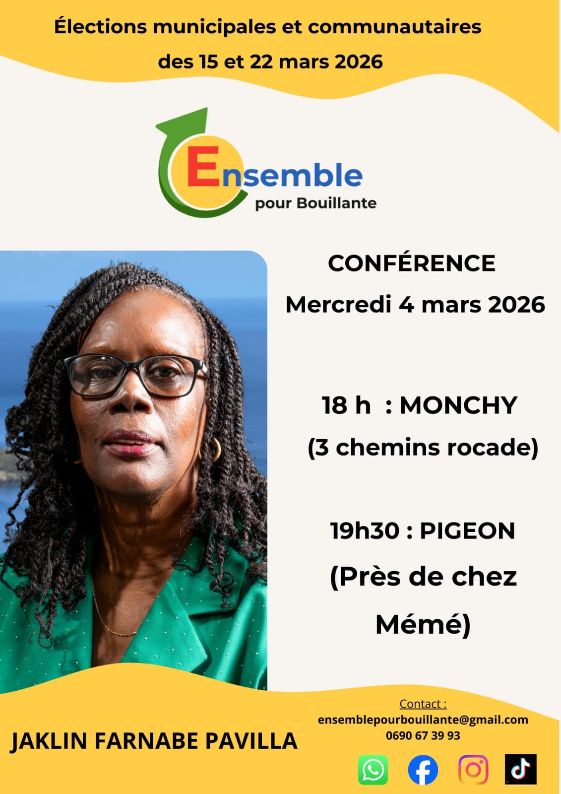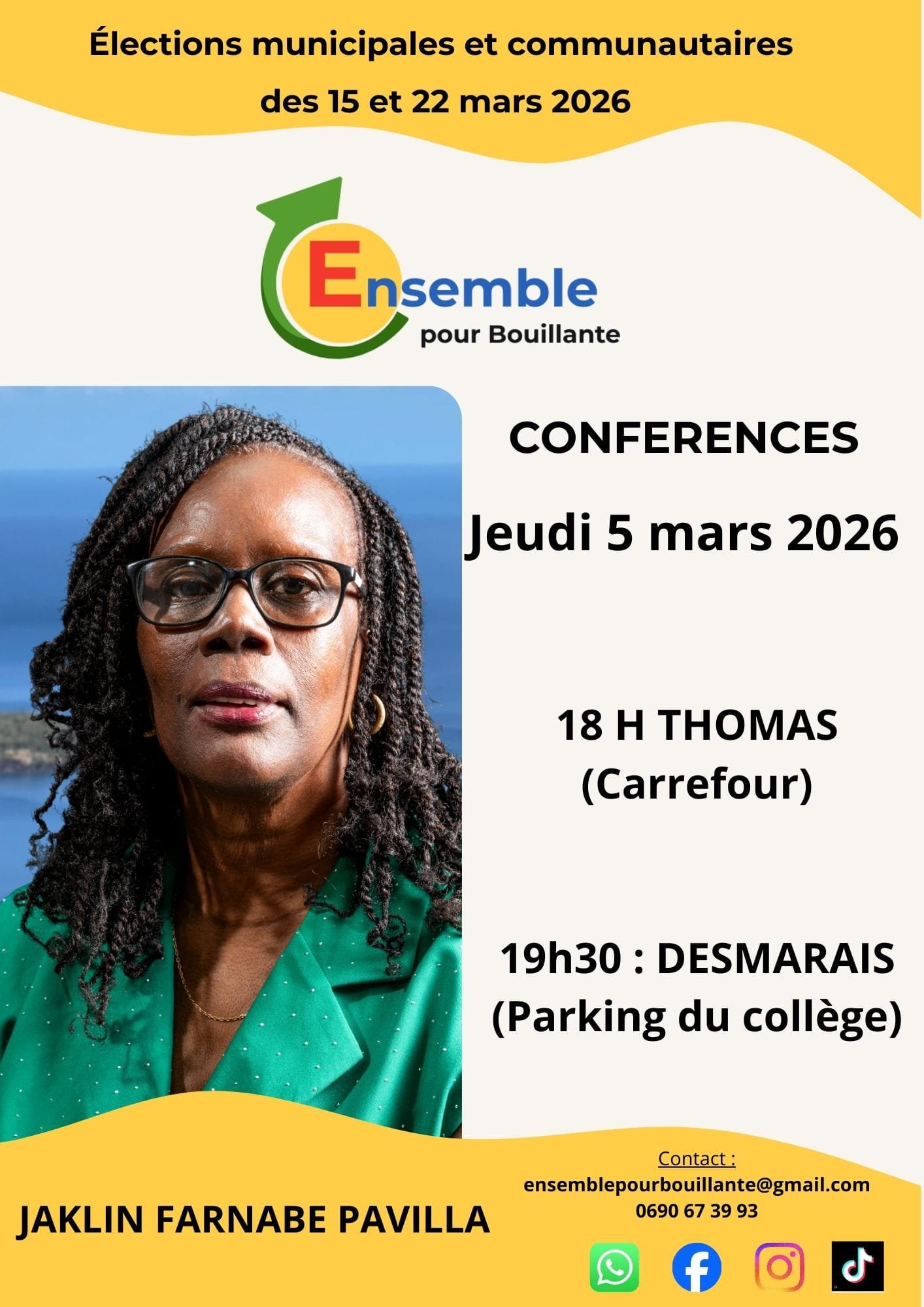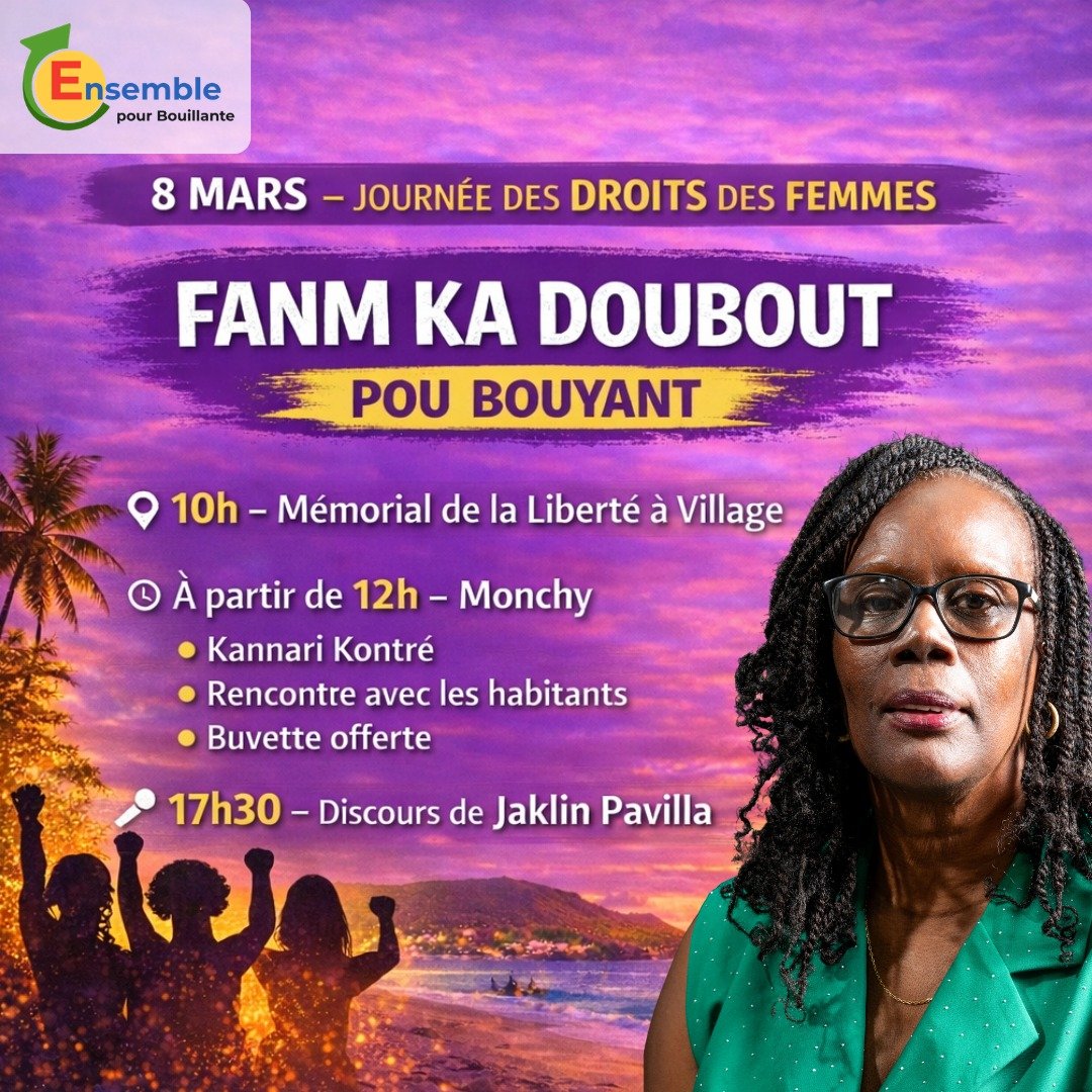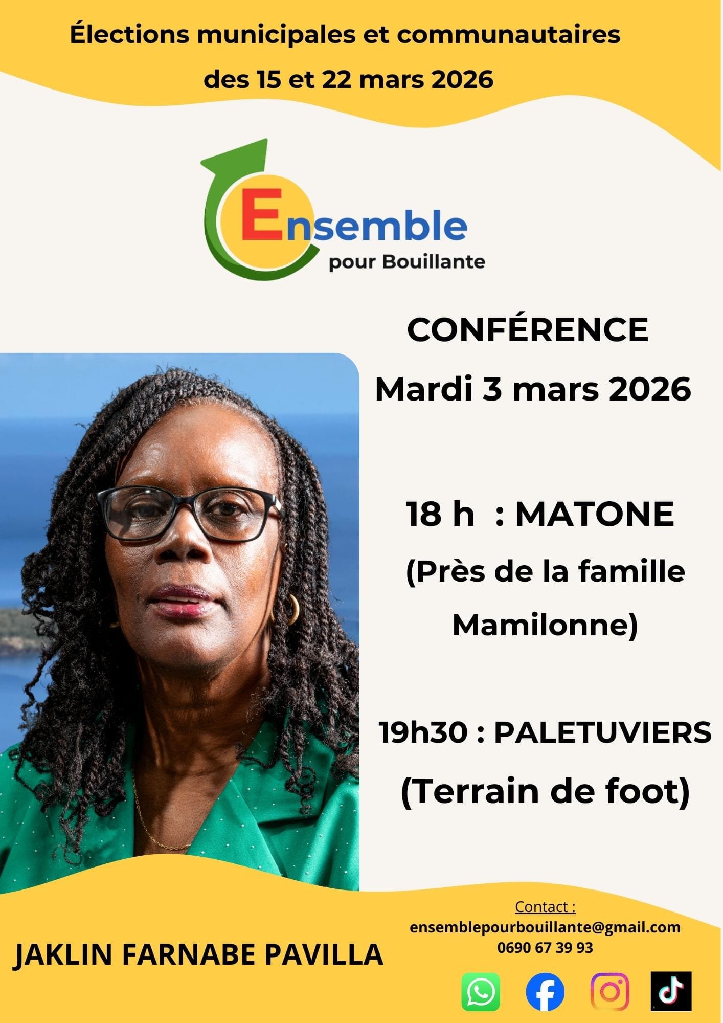 Ma candidature repose sur une conviction simple et forte : les Bouillantaises et les Bouillantais doivent être en mesure de choisir un programme qui nous permet de construire ensemble l'avenir de notre commune. L'équipe que je suis fière de conduire est ancrée dans la réalité locale. Elle est attentive aux besoins de chaque quartier, respectueuse de notre environnement et engagée aux côtés de la jeunesse. Nous voulons renforcer la proximité, soutenir les initiatives locales, valoriser la vie associative et remettre la population au cœur des décisions. En un mot, apprendre à faire société, ensemble.